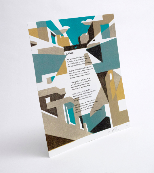 Paul has produced this limited edition print for Faber & Faber, it illustrates a poem called 'A Vision' by the poet Simon Armitage. The prints are limited to 100 copies. Paul is a London based printmaker renowned for sharp linocuts of architectural landmarks, book covers and posters, to see his extensive catalogue please visit his portfolio page.